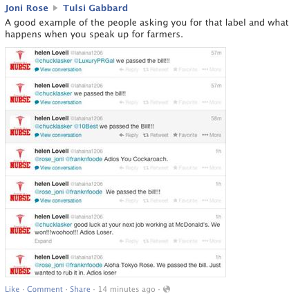 So the anti-GMO bill 2491 veto was overridden today and it is no surprise that those same A’oles are at it again and can’t control their mouths or their behavior. It is amazing that there are adults out there like Helen Lovell who complain about no aloha and then publicly post this kind of stuff all over the social media. What she hasn’t yet realized is that this is just day one and it’s not even enacted yet. Thank goodness she didn’t tell anyone to drink poison or threaten crop destruction.