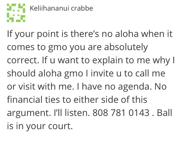 Funny how some A’oles have denied that it is only a small minority of activists who have no aloha. They will claim that the ones who have made threats of crop destruction and death threats just don’t reflect the overall goal, the right to know. Well today Keliihananui Crabbe has finally come clean with theirContinue reading “The A’oles Admit It: There is No Aloha!”