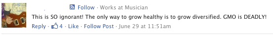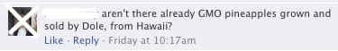 Of course they had to add their A’ole GMO issue with crop contamination and corporate hate and that they actually support an exemption of papayas??? And then to mention a rumor that the papaya farmer did this himself to collect insurance is yet another odd comment. Funny how they smother the love and no hostility comments too. That they claim to support farmers is a joke because what else do they demand? A label that would actually harm the small farmers who use this technology. I had to respond back to this person with: