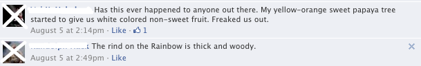 So when this latest incident of papaya destruction occurred in Puna several days ago, no one can deny that it may have a high likelihood of agroterrorism since that has been the talk all over the social media for the past year. I’ve seen it all over various A’ole GMO pages. Some A’oles even have the gall to promote crop destruction on the Star Advertiser Facebook article (note another ignoramus “likes” it too):
